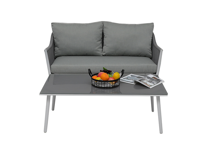 | Pagtukoy | Ang frame ng aluminyo na may lubid na weaved, 4pcs sa kabuuan; Loveseat: L75*W135*H76cm, 1pc Single Chair: L75*W75*H76cm, 2pcs Table ng Kape: L114*W60*H38.5cm, 5mm tempered Grey Glass, 1pc |