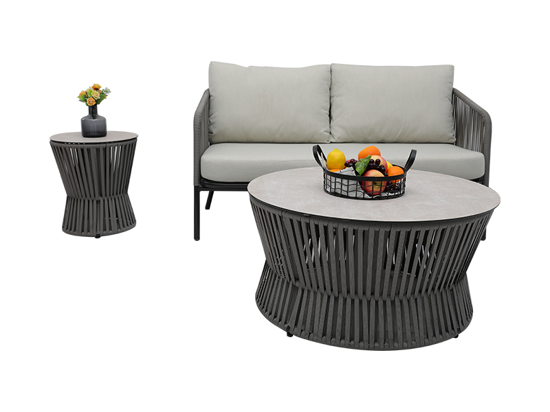 | Pagtukoy | Ang frame ng aluminyo na may flat lubid na weaved, 10cm upuan unan na may espongha sa loob, likod ng unan na may pagpuno ng hibla sa loob, 230g/m2 polyester cushion na tela; solong upuan: l82*w75*h69cm, 2pcs; Loveseat Chair: L82*W142*H69cm, 1pc; Talahanayan ng Kape: ∮85*H43cm, 6mm Glass Batay sa mga keramika; Side Table: ∮42*H48cm, 6mm glass batay sa mga keramika |